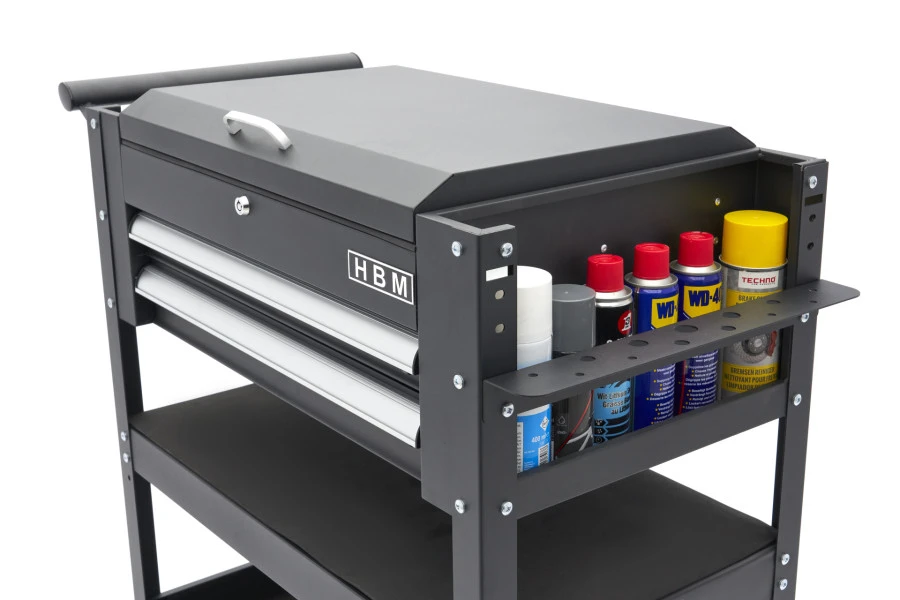 Een opgeruimde werkplaats of garage is te realiseren met deze HBM 2 Laden Gereedschapswagen Met 2 Plateaus en Opbergvak. Al je gereedschap netjes opgeborgen in deze solide en stevige gereedschapswagen,