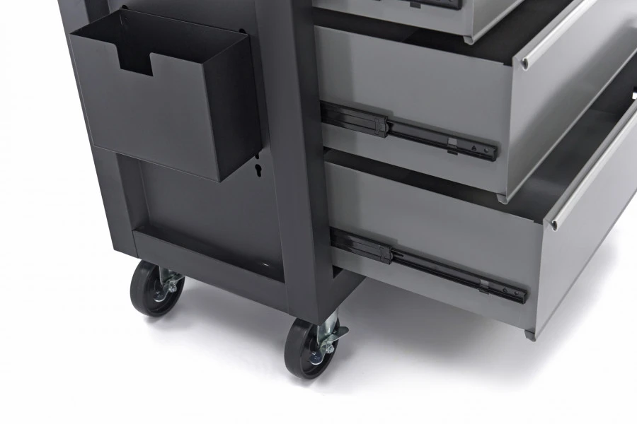 Deze gereedschapswagen biedt voldoende ruimte voor het veilig opbergen van allerlei soorten gereedschap. Het is de ideale oplossing voor kleinere werkplaatsen en garages. Je duwt de wagen vlot voortuit met een uitstekend, stevig handvat vooraan. Daarbij beschik je naast over lades ook over een klein opbergvakje aan de voorzijde.